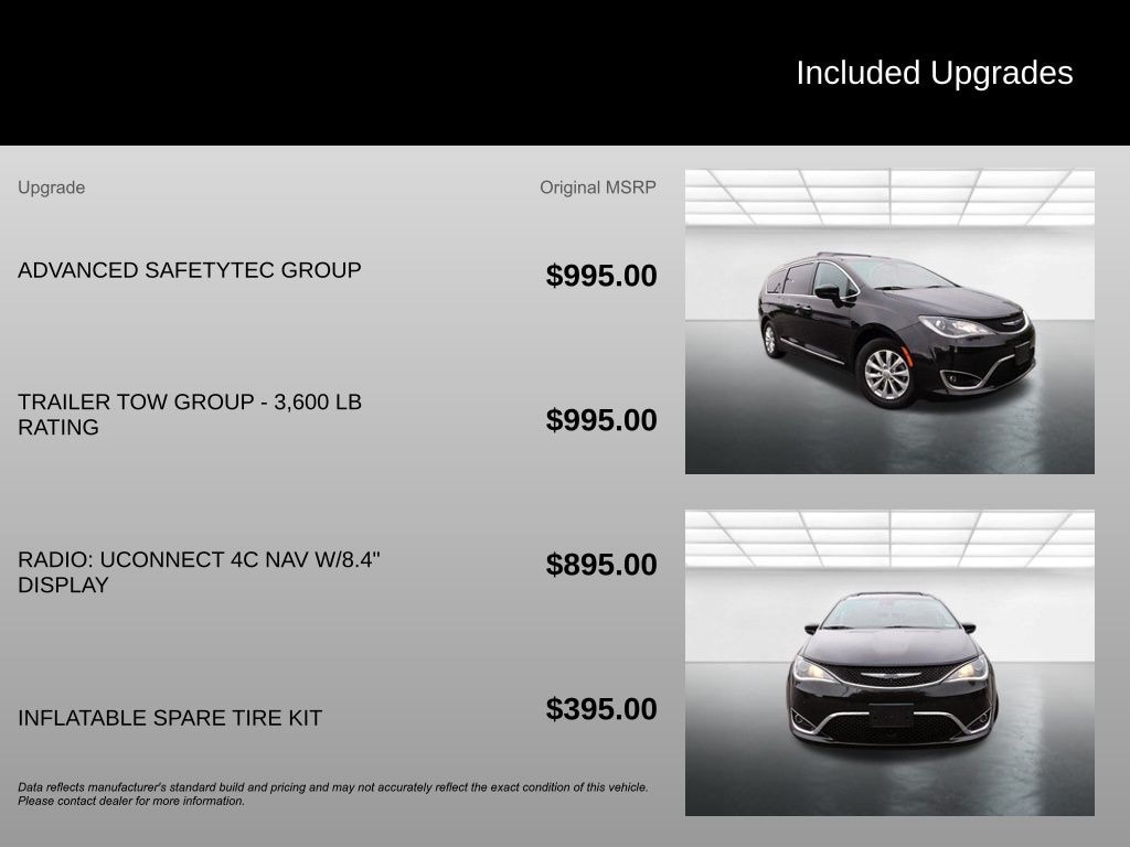 Advanced SafetyTec Group (360 Surround View Camera System, 7" Full Color TFT Display, Acoustic Windshield, Adaptive Cruise Control w/Stop & Go, Advanced Brake Assist, Automatic High Beam Headlamp Control, Blind Spot & Cross Path Detection, Full Speed Forward Collision Warning Plus, Lane Departure Warning Plus, Parallel & Perp Park Assist w/Stop, ParkSense Front/Rear Park Assist w/Stop, and Rain Sensitive Windshield Wipers), Quick Order Package 27L, Trailer Tow Group - 3,600 lb Rating (220 Amp Alternator, 7 & 4 Pin Trailer Tow Wiring Harness, Heavy-Duty Radiator, Hitch w/2" Receiver, and Trailer Sway Damping), 1-Year SiriusXM Guardian Trial, 17" x 7.0" Aluminum Wheels, 3.25 Axle Ratio, 3rd row seats: split-bench, 4-Wheel Disc Brakes, 4G LTE Wi-Fi Hot Spot, 5-Year SiriusXM Traffic Service, 5-Year SiriusXM Travel Link Service, 6 Speakers, 8.4" Touchscreen Display, ABS brakes, Air Conditioning, Alloy wheels, AM/FM radio: SiriusXM, Apple CarPlay, Apple CarPlay/Android Auto, Auto-dimming Rear-View mirror, Automatic temperature control, Bodyside moldings, Brake assist, Bumpers: body-color, Compass, Delay-off headlights, Disassociated Touchscreen Display, Driver door bin, Driver vanity mirror, Driver's Seat Mounted Armrest, Dual front impact airbags, Dual front side impact airbags, Electronic Stability Control, Emergency communication system: Uconnect Access, For Details, Visit DriveUconnect.com, Four wheel independent suspension, Front anti-roll bar, Front Bucket Seats, Front dual zone A/C, Front fog lights, Front reading lights, Fully automatic headlights, Garage door transmitter, Google Android Auto, GPS Antenna Input, GPS Navigation, HD Radio, Heated door mirrors, Heated front seats, Heated steering wheel, Illuminated entry, Integrated Voice Command w/Bluetooth, Knee airbag, Leather steering wheel, Low tire pressure warning, Occupant sensing airbag, Outside temperature display, Overhead airbag, Overhead console, Panic alarm, ParkView Rear Back-Up Camera, Passenger door bin, Passenger seat mounted armrest, Passenger vanity mirror, Perforated Leather Trim Bucket Seats, Power door mirrors, Power driver seat, Power Liftgate, Power steering, Power windows, Radio data system, Radio: Uconnect 4 w/7" Display, Radio: Uconnect 4C Nav w/8.4" Display, Rain sensing wipers, Rear air conditioning, Rear reading lights, Rear window defroster, Rear window wiper, Reclining 3rd row seat, Remote keyless entry, Roof rack, Security system, SiriusXM Satellite Radio, SiriusXM Traffic Plus, SiriusXM Travel Link, Speed control, Split folding rear seat, Spoiler, Steering wheel mounted audio controls, Tachometer, Telescoping steering wheel, Tilt steering wheel, Toffee Seats, Touring Suspension, Traction control, Trip computer, USB Host Flip, Variably intermittent wipers, and VoltmeteR.