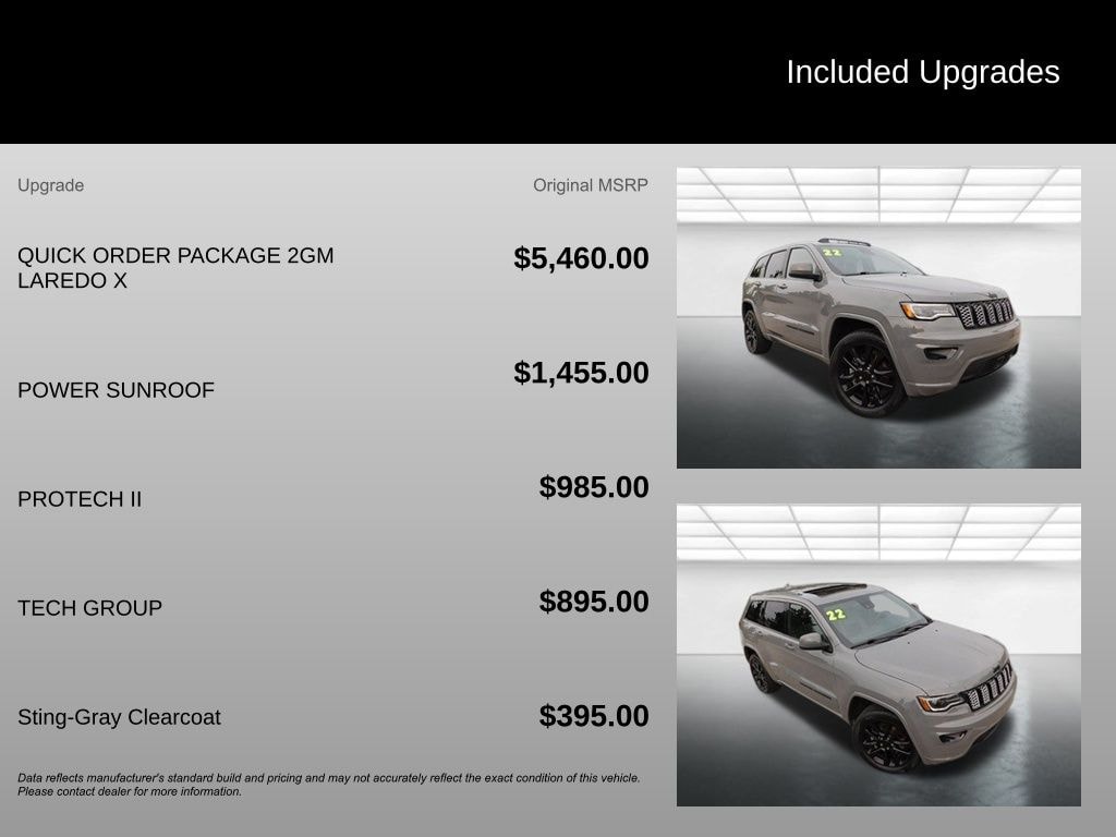 Altitude Appearance Package (Hill Descent Control, Quadra-Trac II 4WD System, Wheels: 20" x 8.0" Gloss Black Aluminum, Altitude Grille, Body Color Claddings, Body Color Fascia, Body Color Shark Fin Antenna, Dark Day Light Opening Moldings, Dark Headlamp Bezel Finish, Dark Lens Taillamps, Delete Laredo Badge, Front Accent/Body Color Fascia, Gloss Black Jeep Badging, Gloss Black Rear Fascia Applique, Rear Accent/Body Color Fascia, Rear Fascia Black Molded in Color Step Pad, Selec-Terrain System, and Single Exhaust w/Bright Tip), Protech II (Advanced Brake Assist, Auto High Beam Headlamp Control, Full Speed FWD Collision Warn Plus, and Lane Departure Warning Plus), Quick Order Package 2GM Laredo X (DISC) (115V Auxiliary Power Outlet, Black Suede Seats w/Black Stitching, Heated Front Seats, Heated Steering Wheel, Power Liftgate, Remote Start System, Security Alarm, Steering Wheel Mounted Audio Controls, and Universal Garage Door Opener), Tech Group (506 Watt Amplifier, Active Noise Control System, Bi-Xenon High-Intensity Discharge Headlamps, Front LED Fog Lamps, LED Daytime Running Headlamps, and Premium Alpine Speaker System), Power Sunroof, 3.45 Rear Axle Ratio, 4-Wheel Disc Brakes, 6 Speakers, ABS brakes, Air Conditioning, AM/FM radio: SiriusXM, Anti-whiplash front head restraints, Apple CarPlay/Android Auto, Auto-dimming Rear-View mirror, Automatic temperature control, Brake assist, Bumpers: body-color, Cloth Bucket Seats, Compass, Delay-off headlights, Driver door bin, Driver vanity mirror, Dual front impact airbags, Dual front side impact airbags, Electronic Stability Control, Emergency communication system: SiriusXM Guardian, Four wheel independent suspension, Front anti-roll bar, Front Bucket Seats, Front Center Armrest w/Storage, Front dual zone A/C, Front fog lights, Front reading lights, Fully automatic headlights, Heated door mirrors, Illuminated entry, Knee airbag, Leather Shift Knob, Low tire pressure warning, Navigation System, Normal Duty Suspension, Occupant sensing airbag, Outside temperature display, Overhead airbag, Overhead console, Panic alarm, ParkView Rear Back-Up Camera, Passenger door bin, Passenger vanity mirror, Power door mirrors, Power driver seat, Power steering, Power windows, Radio data system, Radio: Uconnect 4C Nav w/8.4" Display, Rear anti-roll bar, Rear reading lights, Rear seat center armrest, Rear window defroster, Rear window wiper, Remote keyless entry, Speed control, Speed-sensing steering, Speed-Sensitive Wipers, Split folding rear seat, Spoiler, Steering wheel mounted audio controls, Tachometer, Telescoping steering wheel, Tilt steering wheel, Traction control, Trip computer, and Variably intermittent wipers.