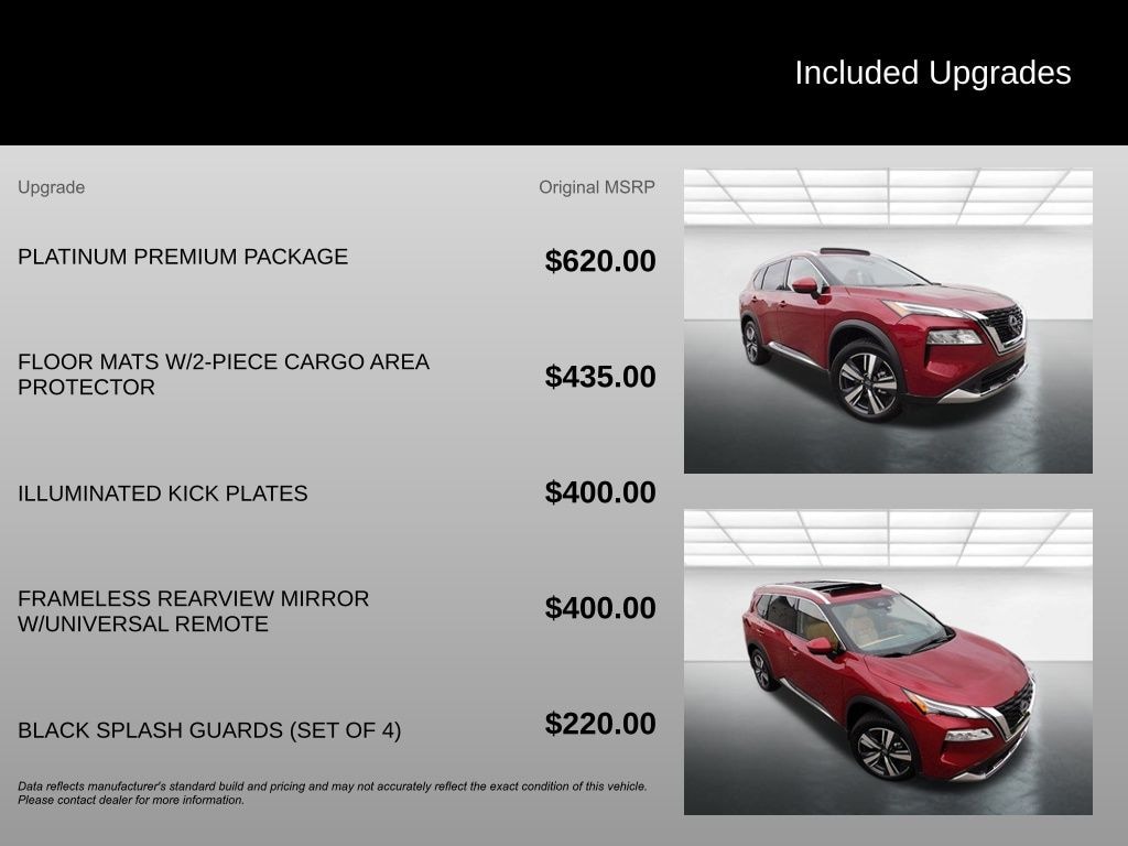 Platinum Premium Package (Heads-Up Display, Rear Heated Seats, and Tri-Zone HVAC), AWD, 19" Aluminum Alloy Wheels, Navigation system: NissanConnect Navigation, Power moonroof, 10 Speakers, 4-Wheel Disc Brakes, 5.604 Axle Ratio, ABS brakes, Air Conditioning, AM/FM radio: SiriusXM, Auto High-beam Headlights, Auto-dimming Rear-View mirror, Automatic temperature control, Black Splash Guards (Set of 4), Bose Premium Audio System, Brake assist, Bumpers: body-color, Chrome Rear Bumper Protector, Delay-off headlights, Driver door bin, Driver vanity mirror, Dual front impact airbags, Dual front side impact airbags, Electronic Stability Control, Emergency communication system: NissanConnect Services, First Aid Kit, Floor Mats w/2-Piece Cargo Area Protector, Four wheel independent suspension, Frameless Rearview Mirror w/Universal Remote, Front anti-roll bar, Front Bucket Seats, Front Center Armrest, Front dual zone A/C, Front reading lights, Fully automatic headlights, Heated door mirrors, Heated Front Bucket Seats, Heated front seats, Heated steering wheel, Illuminated entry, Illuminated Kick Plates, Knee airbag, Leather steering wheel, Low tire pressure warning, Memory seat, NissanConnect featuring Apple CarPlay and Android Auto, Occupant sensing airbag, Outside temperature display, Overhead airbag, Overhead console, Panic alarm, Passenger door bin, Passenger vanity mirror, Power door mirrors, Power driver seat, Power Liftgate, Power passenger seat, Power steering, Power windows, Quilted Semi-Aniline Leather Seat Trim, Radio data system, Radio: AM/FM NissanConnect w/Navigation, Rear anti-roll bar, Rear reading lights, Rear seat center armrest, Rear side impact airbag, Rear window defroster, Rear window wiper, Remote keyless entry, Security system, Speed control, Speed-Sensitive Wipers, Split folding rear seat, Spoiler, Steering wheel mounted audio controls, Tachometer, Telescoping steering wheel, Tilt steering wheel, Traction control, Trip computer, Turn signal indicator mirrors, USB Charging Cable Set - Nissan, and Variably intermittent wipers.