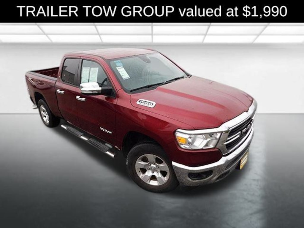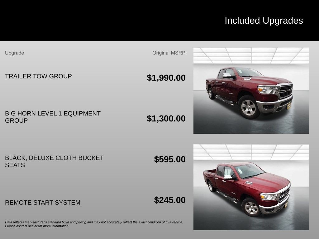 Big Horn Level 1 Equipment Group (Auto-Dimming Exterior Driver Mirror, Auto-Dimming Rear-View Mirror, Black Premium Power Mirrors, Class IV Receiver Hitch, Cluster 3.5" TFT Color Display, Exterior Mirrors Courtesy Lamps, Exterior Mirrors w/Supplemental Signals, Foam Bottle Insert (Door Trim Panel), For More Info, Call 800-643-2112, Glove Box Lamp, Power 4-Way Driver Lumbar Adjust, Power 8-Way Driver Seat, Power Adjustable Pedals, Power-Folding Mirrors, Radio: Uconnect 4 w/8.4" Display, Rear Dome w/On/Off Switch Lamp, Rear Power Sliding Window, Rear Window Defroster, SiriusXM Radio Service, SiriusXM Satellite Radio, Sun Visors w/Illuminated Vanity Mirrors, and Universal Garage Door Opener), Quick Order Package 23Z Big Horn (Big Horn Badge), Trailer Tow Group (Add Class IV Receiver Hitch, Trailer Brake Control, Trailer Light Check, Trailer Reverse Steering Control, and Trailer Tire Pressure Monitoring System), 3 Rear Seat Head Restraints, 3.21 Rear Axle Ratio, 4 Way Front Headrests, 4-Wheel Disc Brakes, 40/20/40 Split Bench Seat, 48V Belt Starter Generator, 6 Speakers, ABS brakes, Air Conditioning, Alloy wheels, AM/FM radio, Black Exterior Mirrors, Brake assist, Bumpers: chrome, Cloth Bench Seat, Compass, Delay-off headlights, Driver door bin, Dual front impact airbags, Dual front side impact airbags, Electronic Stability Control, Front anti-roll bar, Front Center Armrest w/Storage, Front fog lights, Front License Plate Bracket, Front reading lights, Front Seat Back Map Pockets, Front wheel independent suspension, Fully automatic headlights, GPS Antenna Input, Heated door mirrors, Illuminated entry, Integrated Voice Command w/Bluetooth, Leather steering wheel, Low tire pressure warning, Manual Adjust 4-Way Front Passenger Seat, MOPAR Front & Rear Rubber Floor Mats, Occupant sensing airbag, Outside temperature display, Overhead airbag, Overhead console, Panic alarm, ParkView Rear Back-Up Camera, Passenger door bin, Passenger vanity mirror, Power door mirrors, Power steering, Power windows, Radio data system, Radio: Uconnect 3 w/5" Display, Rear 60/40 Folding Seat, Rear anti-roll bar, Rear seat center armrest, Rear step bumper, Remote keyless entry, Remote Start System, Speed control, Split folding rear seat, Steering wheel mounted audio controls, Tachometer, Telescoping steering wheel, Tilt steering wheel, Traction control, Trip computer, Variably intermittent wipers, Voltmeter, and Wheels: 18" x 8" Cast-Aluminum Painted.